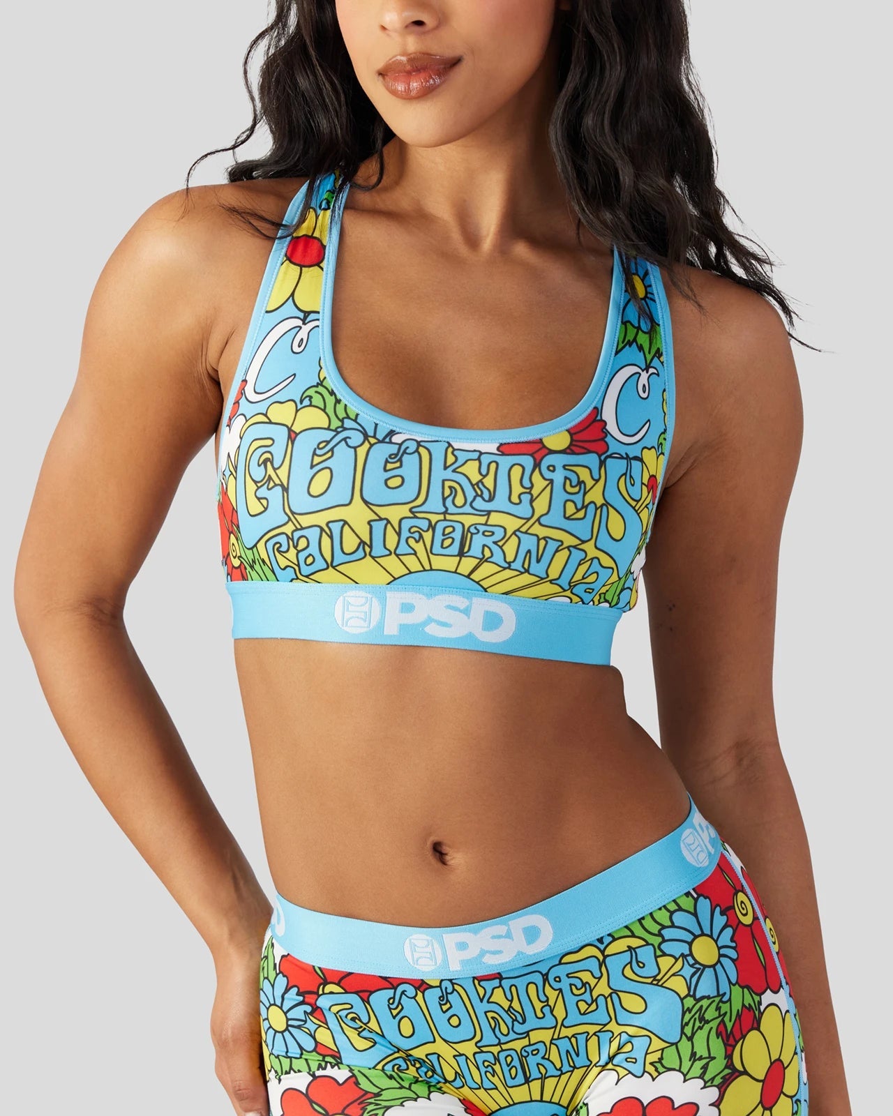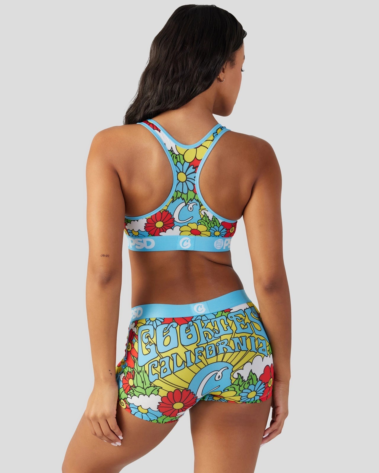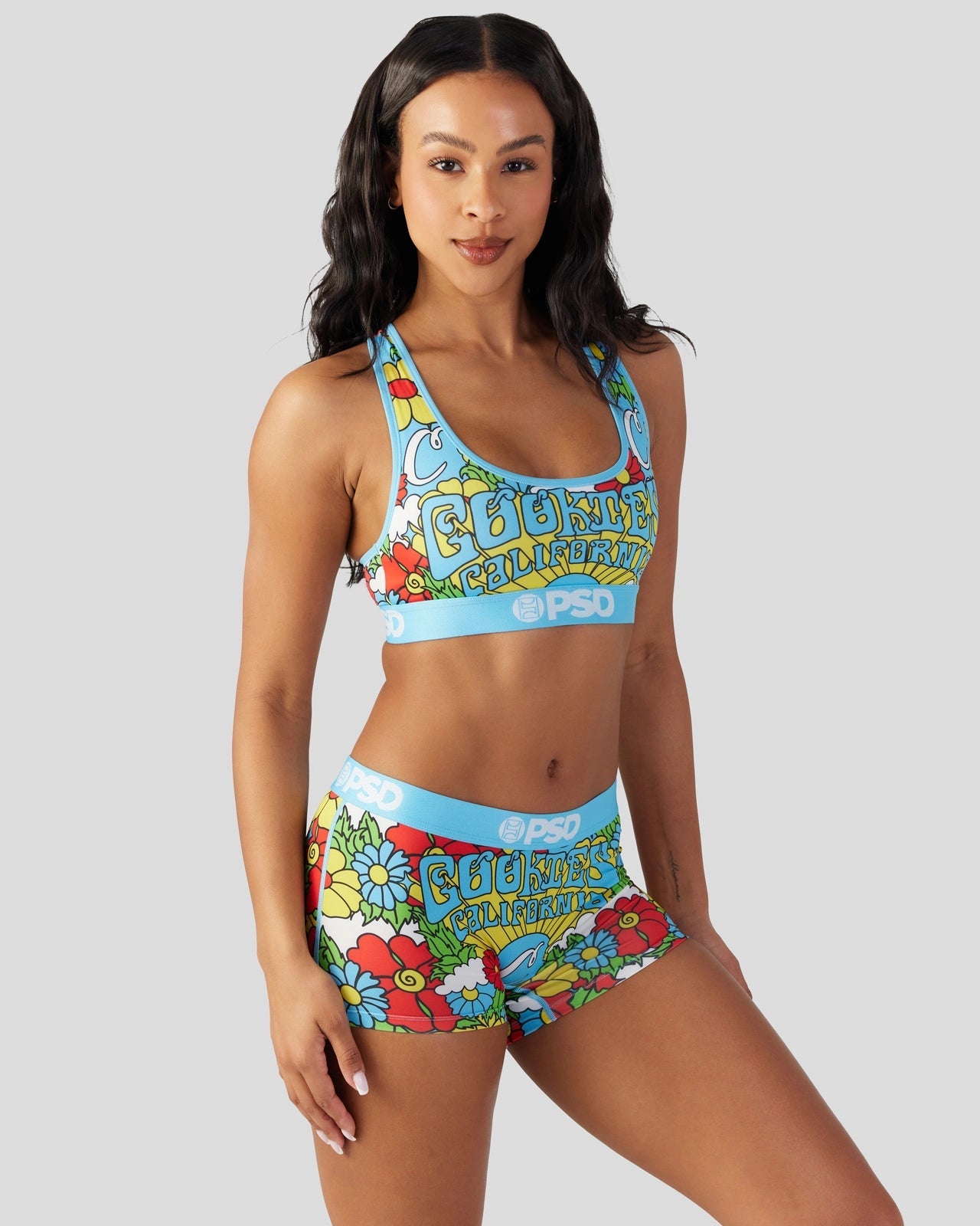 New from Cookies x PSD! With a colorful retro print, the Cali Cookies Sports Bra is made from a silky poly blend with a comfortable full coverage, keep-you-in fit. The PSD boy shorts are perfect for everyday wear and working out.