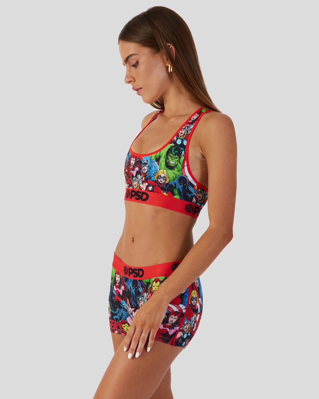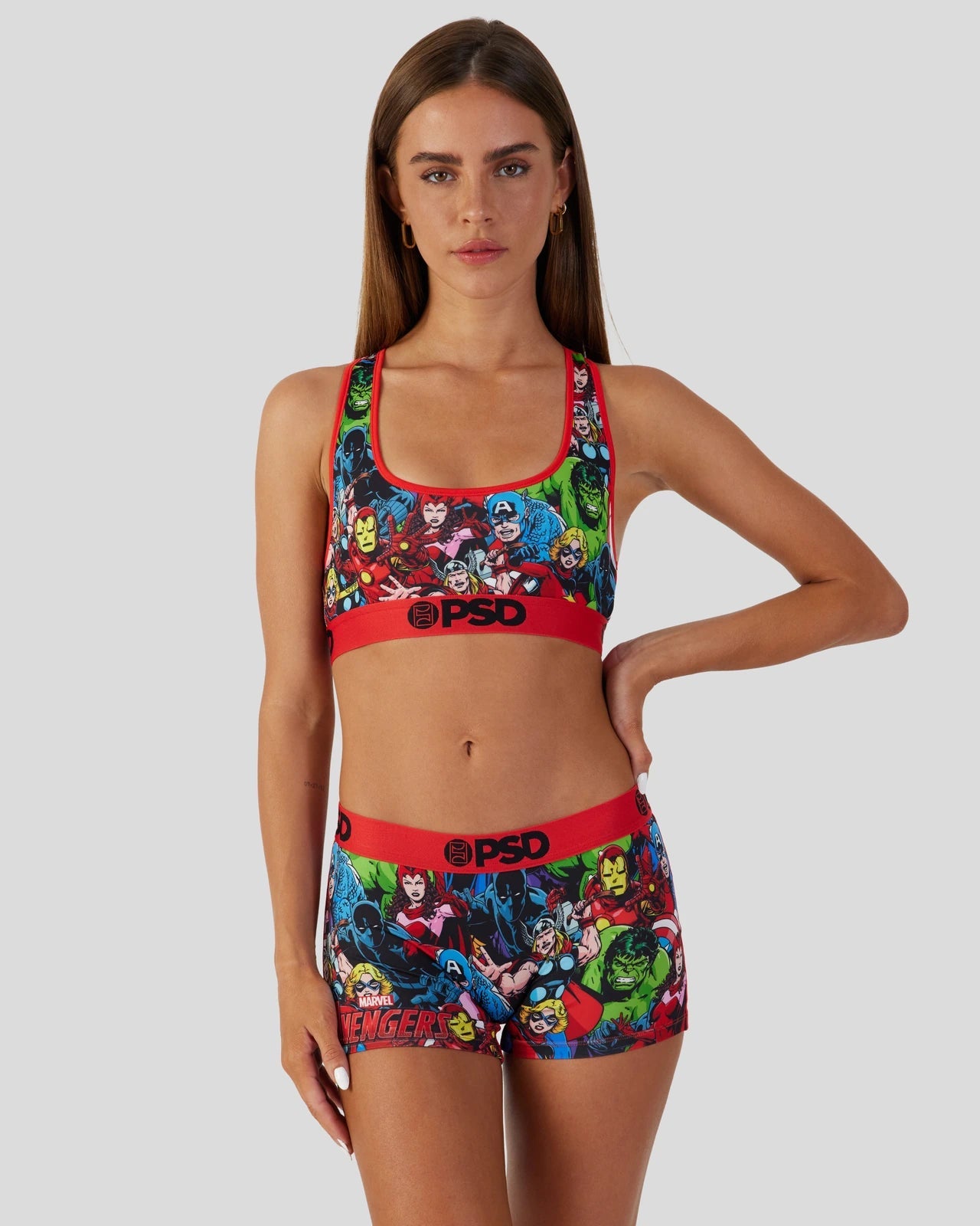 The Marvel – Avengers Sports Bra features members of the Avengers from the Marvel comics assembled in an all-over print that includes Captain America, Black Panther, Iron Man, Thor, Scarlet Witch, and Captain Marvel. Made with our silky poly blend, the Sports Bra is breathable yet slightly compressive, bringing you the comfort and support you need for everything you love to do in life.