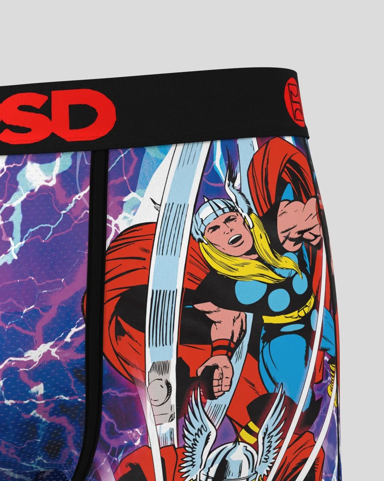 The God of Thunder himself is featured on these boxer briefs wielding the weight of his mighty hammer Mj?lnir with a print of electrifying lightning bolts. With four-way stretch, a breathable MicroMesh pouch, and durable flatlock stitching, these Thor boxers embody the armor of a worthy warrior and were built to hold up for everything from everyday wear to the toughest workouts.