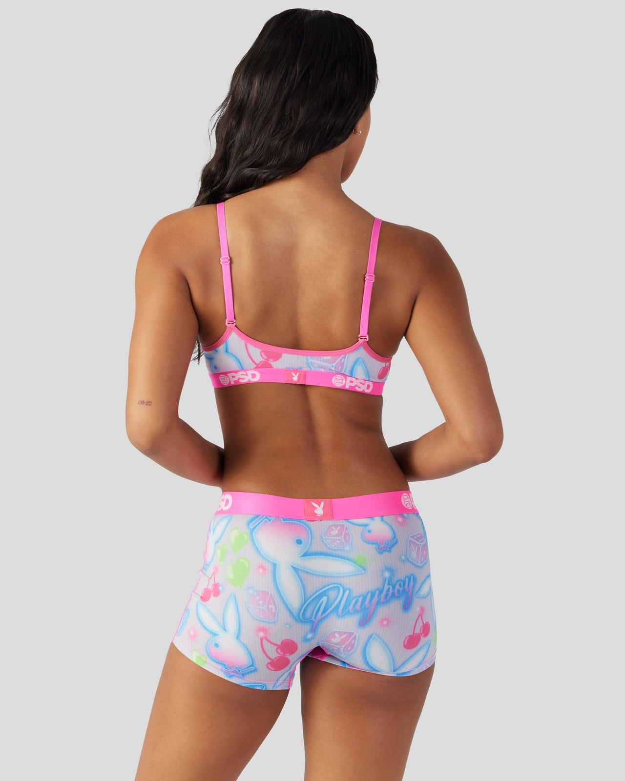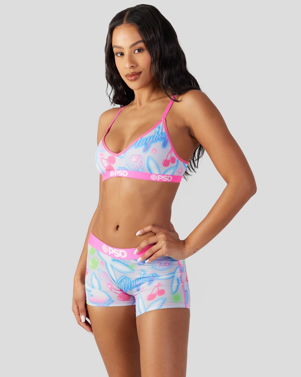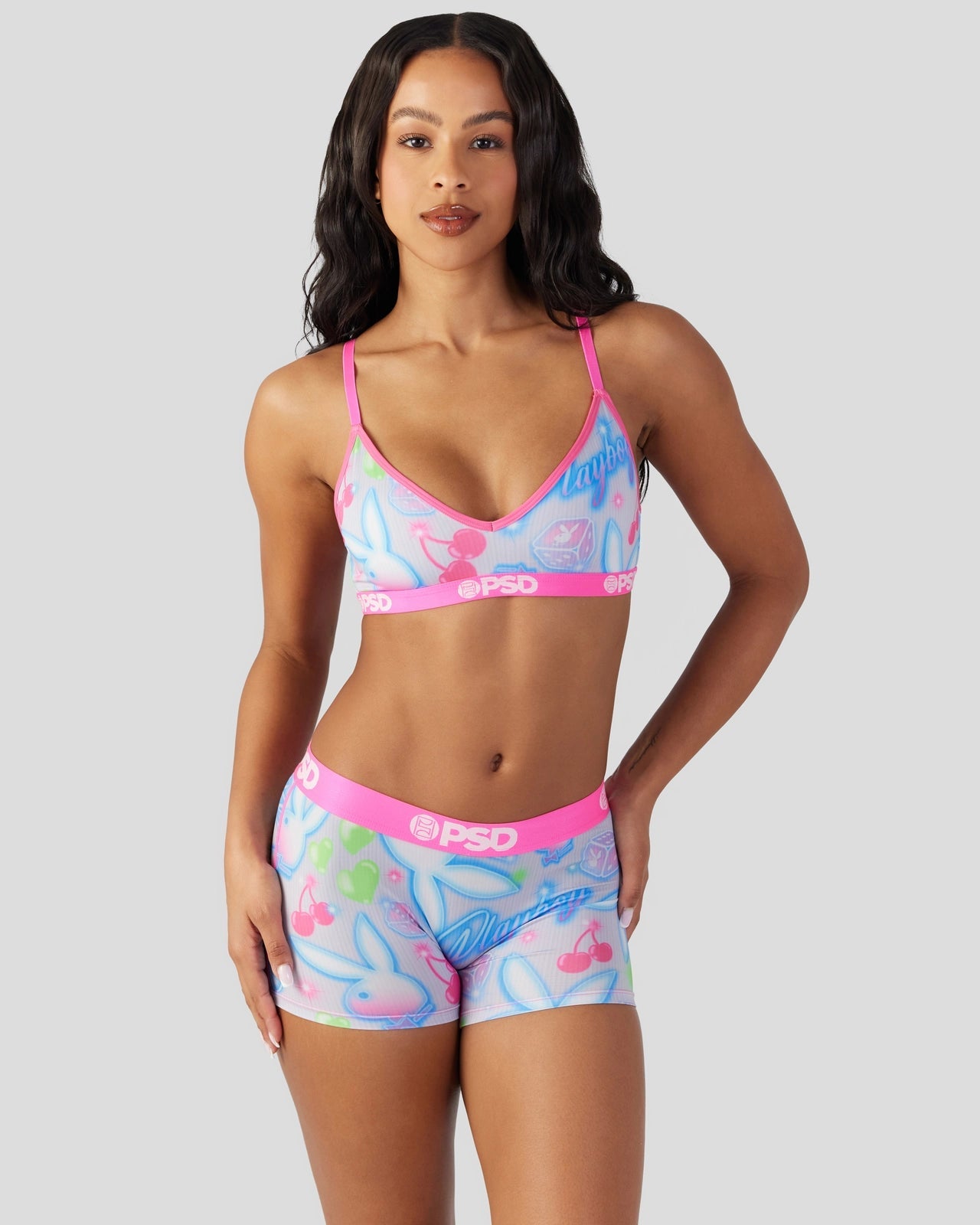 New from Playboy x PSD! Featuring a cute and colorful print perfect for warm-weather seasons, and made of soft and silky fabric, the Summer V-Neck Bralette is light and breathable so you barely feel like it???s there. It gives you full coverage and medium support for those days when you need to wear a bra but really don’t want to.