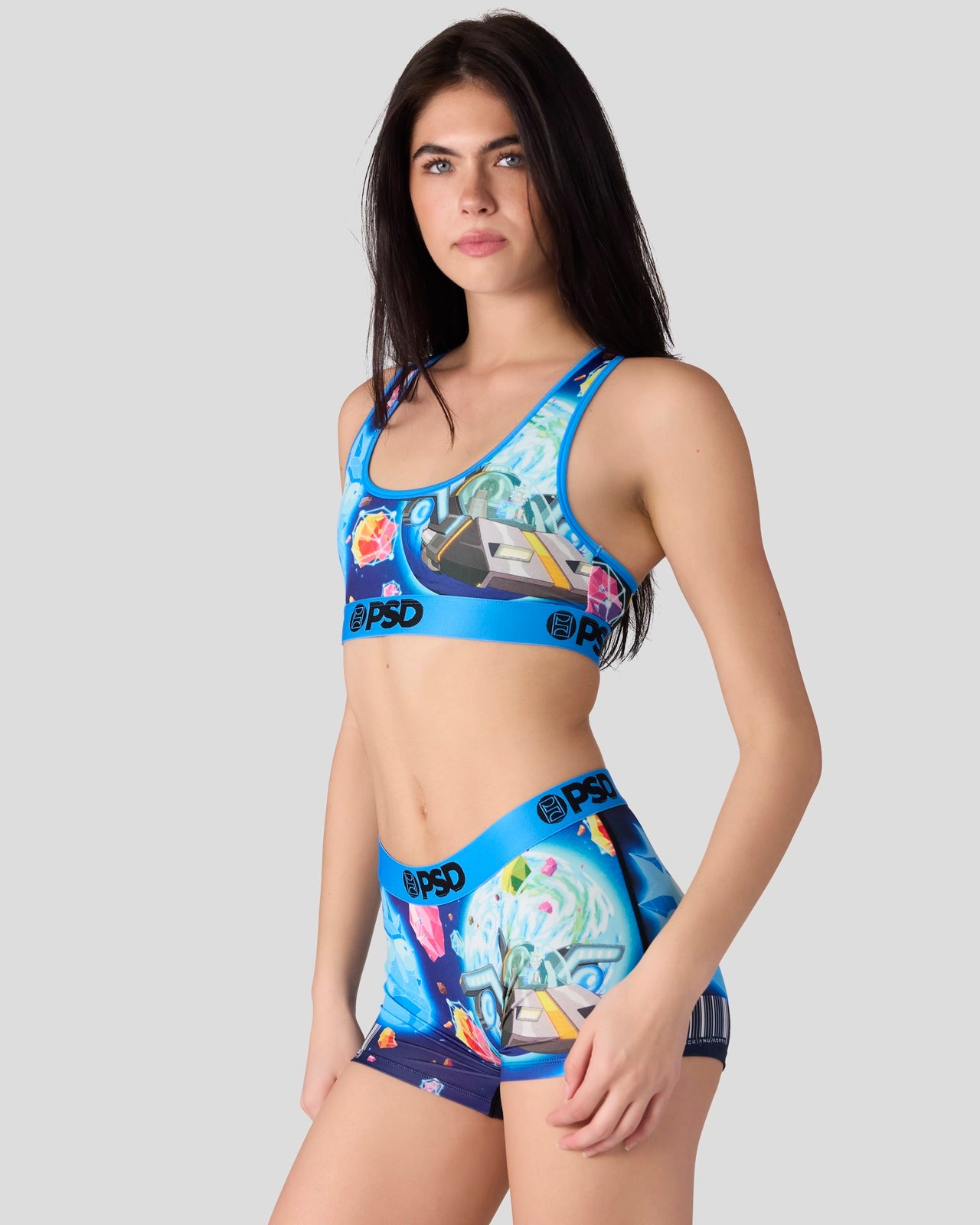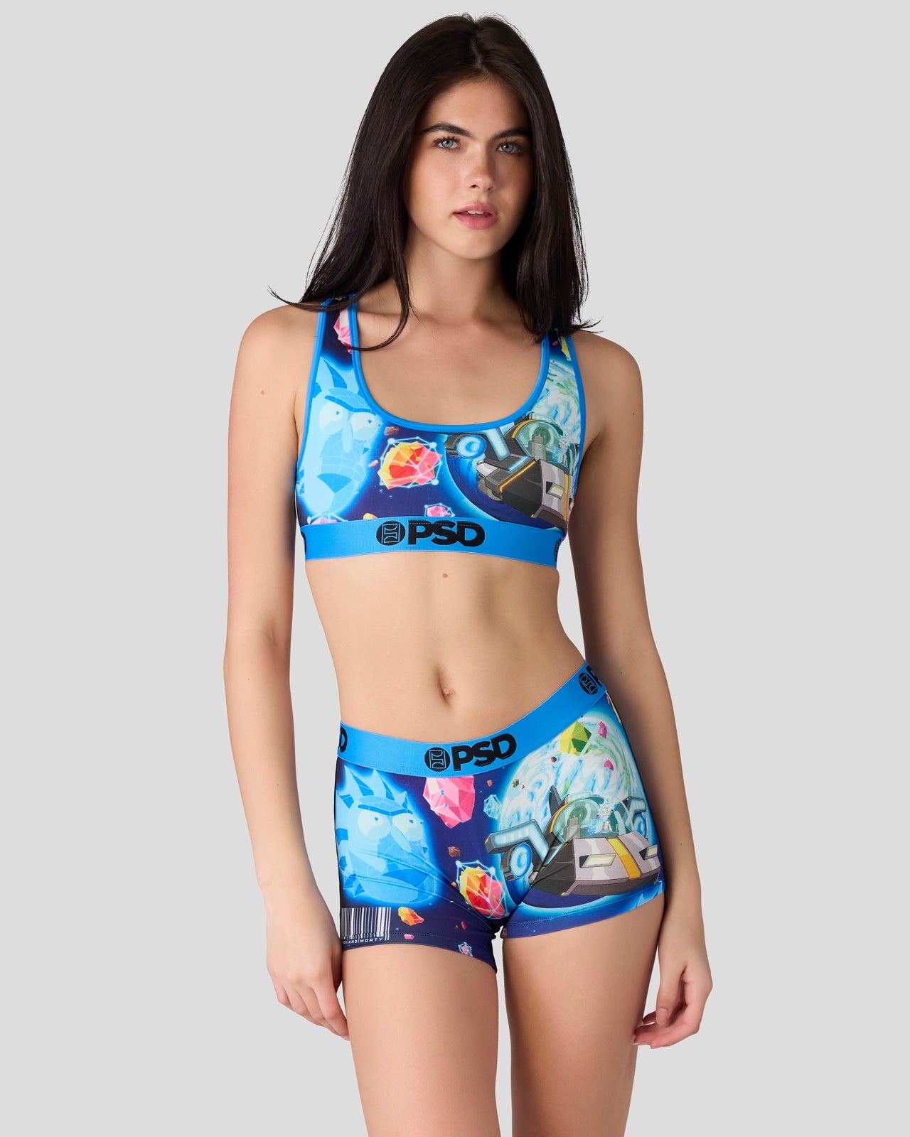 Travel to another dimension with this new pair from Rick & Morty x PSD. The Travels Sports Bra is made from a silky poly blend and is breathable yet slightly compressive, bringing you the comfort and support you need for everything you get into.