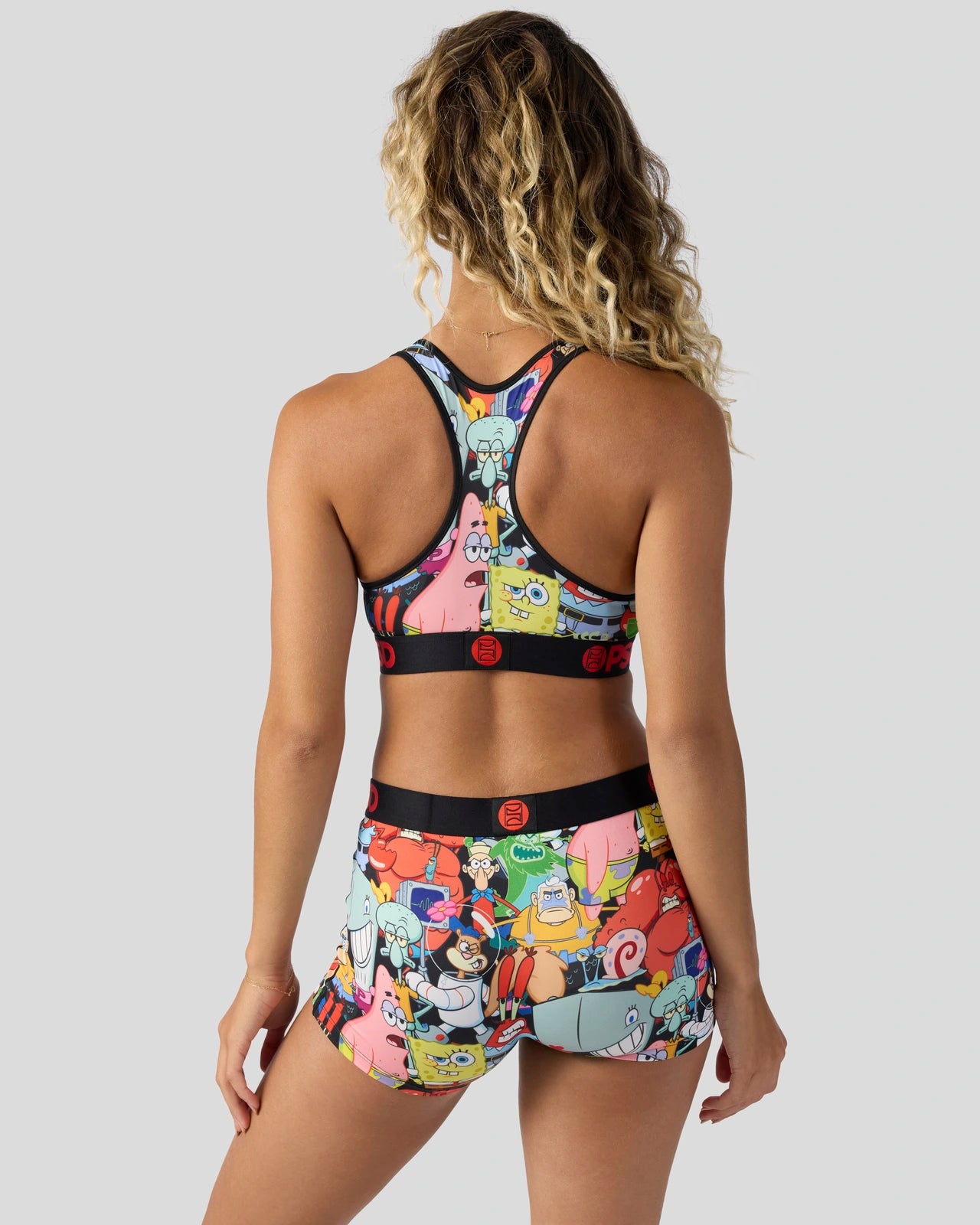 The Squad Sports Bra from SpongeBob SquarePants x PSD is made from a silky poly blend and is breathable yet slightly compressive, bringing you the comfort and support you need for everything you get into.